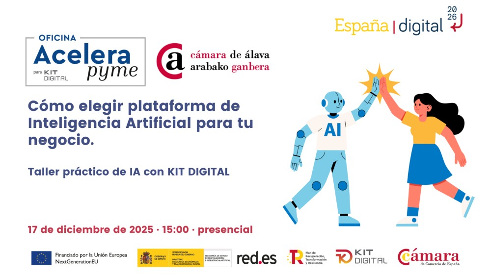 La Oficina Acelera Pyme de la Cámara de Álava te invita a esta jornada presencial gratuita «Empieza a utilizar IA en tu empresa. Taller práctico de ChatGPT con KIT DIGITAL» que tendrá lugar el próximo miércoles 17 de diciembre de 2025 a las 15:00 en formato presencial.