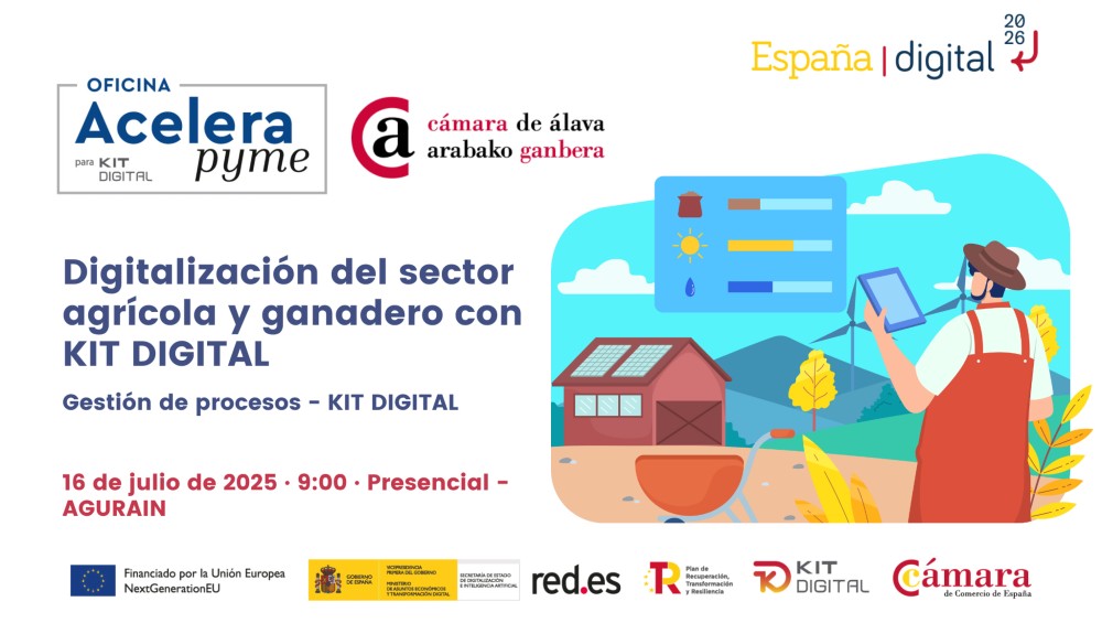 La Oficina Acelera Pyme de la Cámara de Álava te invita a esta jornada presencial gratuita «Digitalización del sector agrícola y ganadero con KIT DIGITAL» que tendrá lugar el próximo 16 de julio de 2025 a las 9:00 en Agurain.